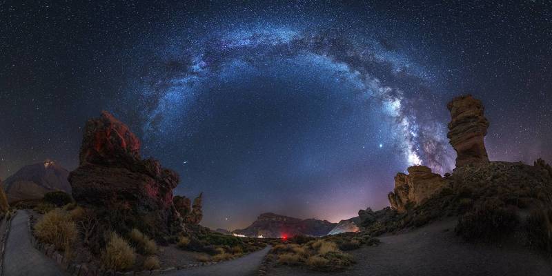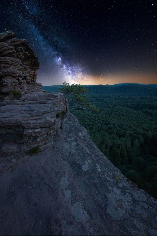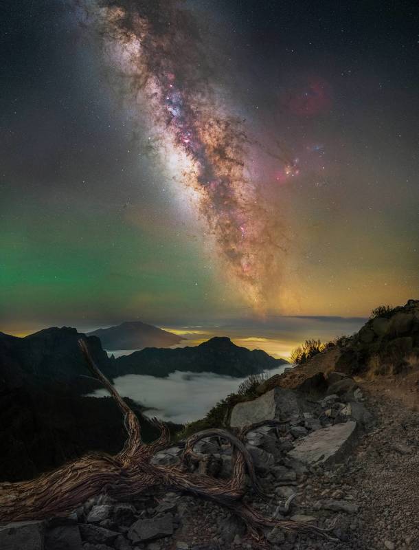 Watching the Milky Way from the top of the La Palma Island is a magic experience that you can't compare with anything else. You have a purely dark sky above you and the clouds underneath. On my way to the place for night shooting I just came across this nice tree that I wanted to use as a part of the scene. The sky conditions were so good that I had a chance to capture some airglow emission.