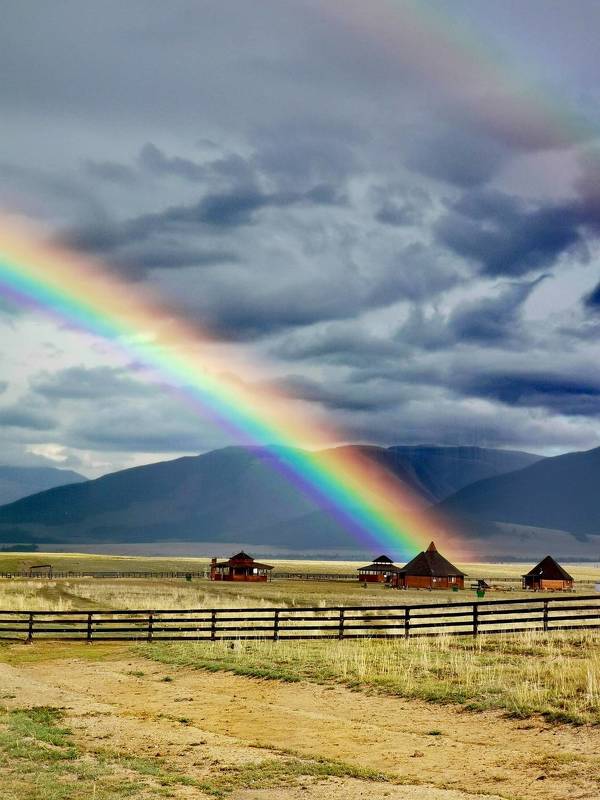Весь день охотились за снежными вершинами Северо-Чуйского хребта, но низкие облака так и не позволили ими полюбоваться. Начинался дождь. Отчаившись, отправились обратно. Дождь оказался непродолжительным, и нашему взору предстала восхитительная радуга. Впервые увидела ее начало...